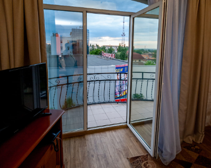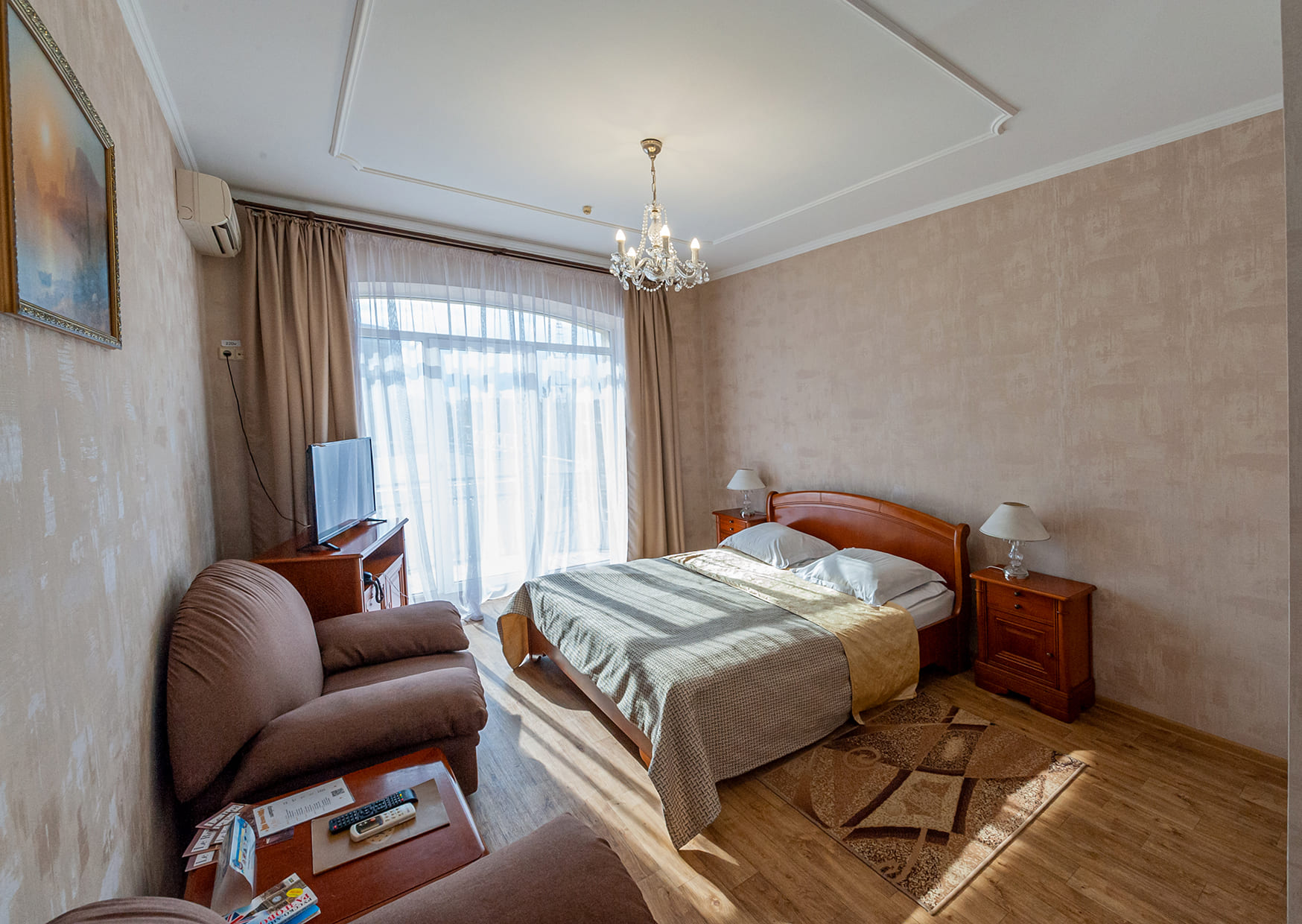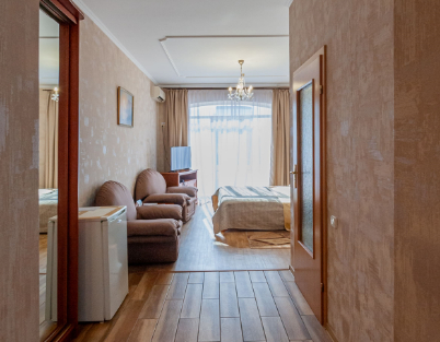 Простора кімната з виходом на балкон чекає на гостей, які звикли до високого рівня комфорту. Гармонійний дизайн інтер'єру, стильні меблі, килимове покриття на підлозі та ліжка підійдуть вам задоволення від перебування у номері. Тут велике двоспальне ліжко, крісла, диван, столик, ліжка. тумбочки, телевізор. Номер має окремий санвузол із душовою кабіною. Також є гігієнічні приладдя, халат, комплект рушників та капці. Площа номеру: 40м.кв.