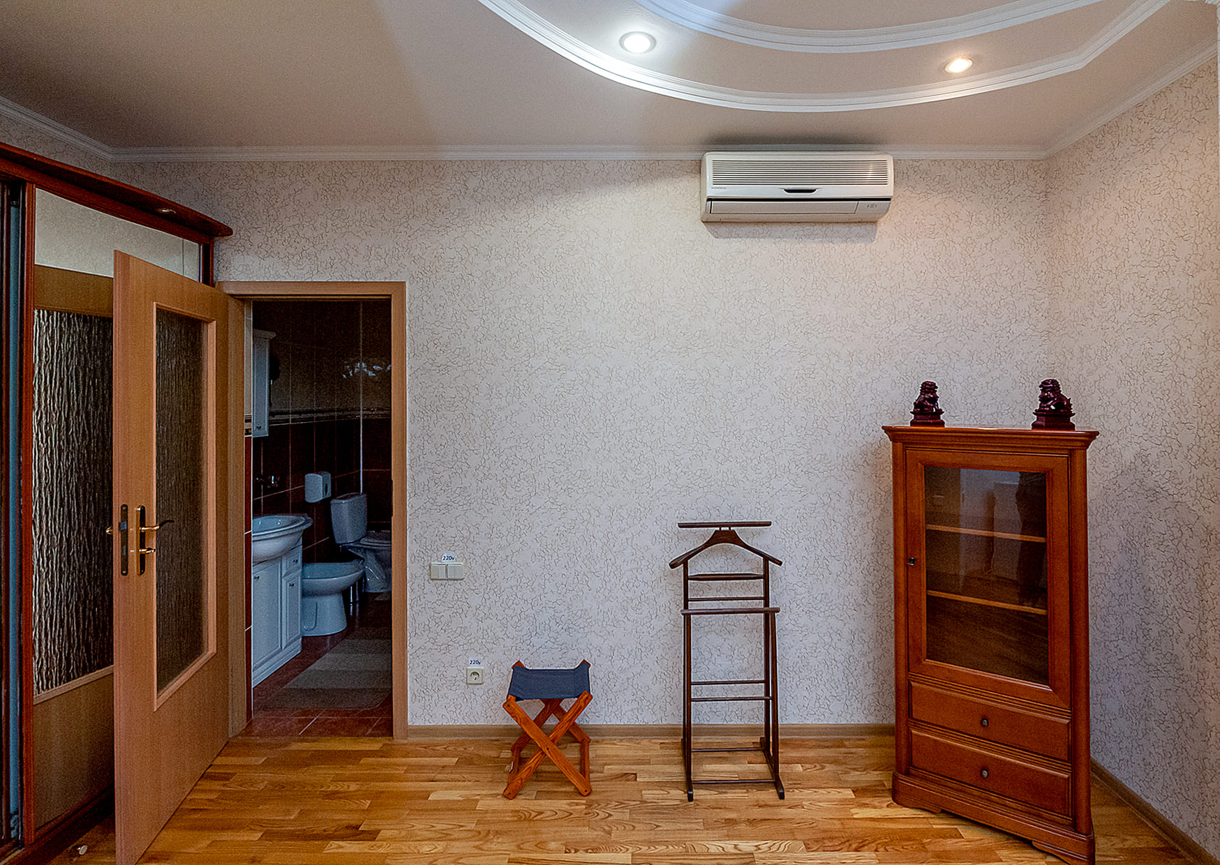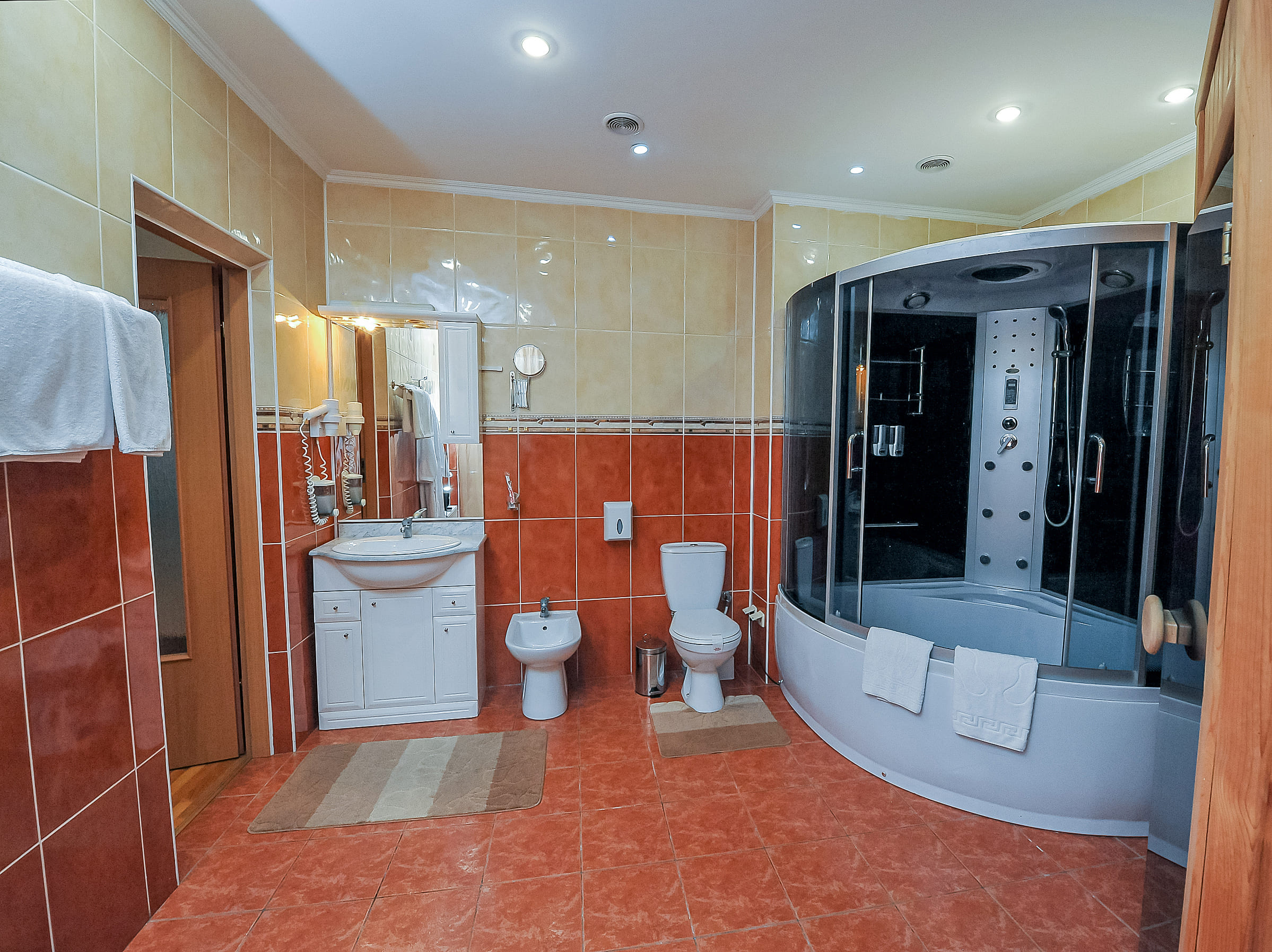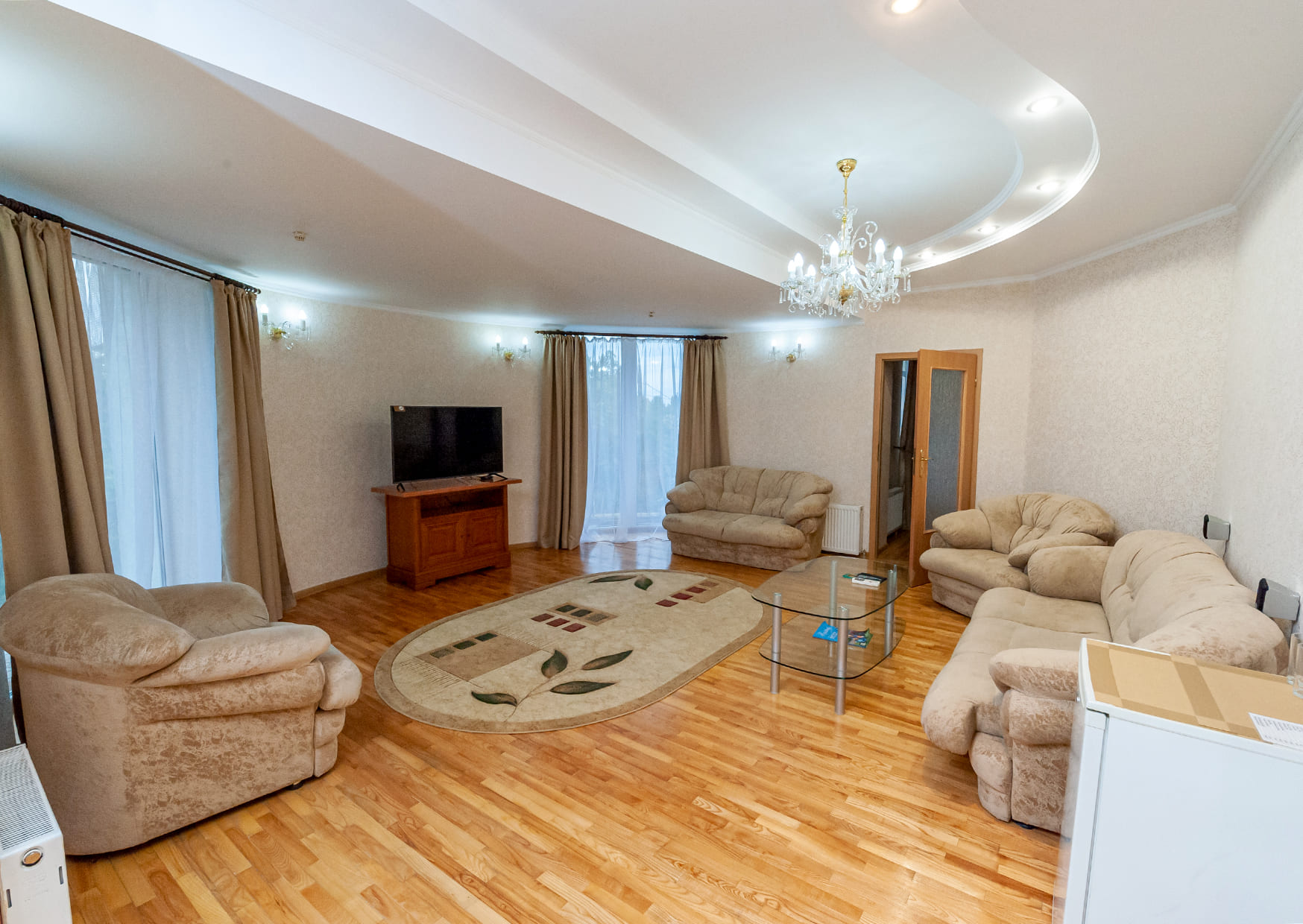 Розкішний інтер'єр Президентського номера створений спеціально для гостей із високими естетичними запитами. Номер обладнаний панорамним балконом. Тут гармонійний та стильний інтер'єр, паркетне покриття, драпірування штор, настільні та вбудовані світильники створюють неповторну атмосферу затишного. та відокремленого простору. Тут нові зручні меблі: двоспальне ліжко з тумбочками, витончений туалетний столик, м'який куточок з розкладним диваном, журнальний столик та сервант. У номері є окрема ванна кімната, обладнана джакузі та власною сауною.