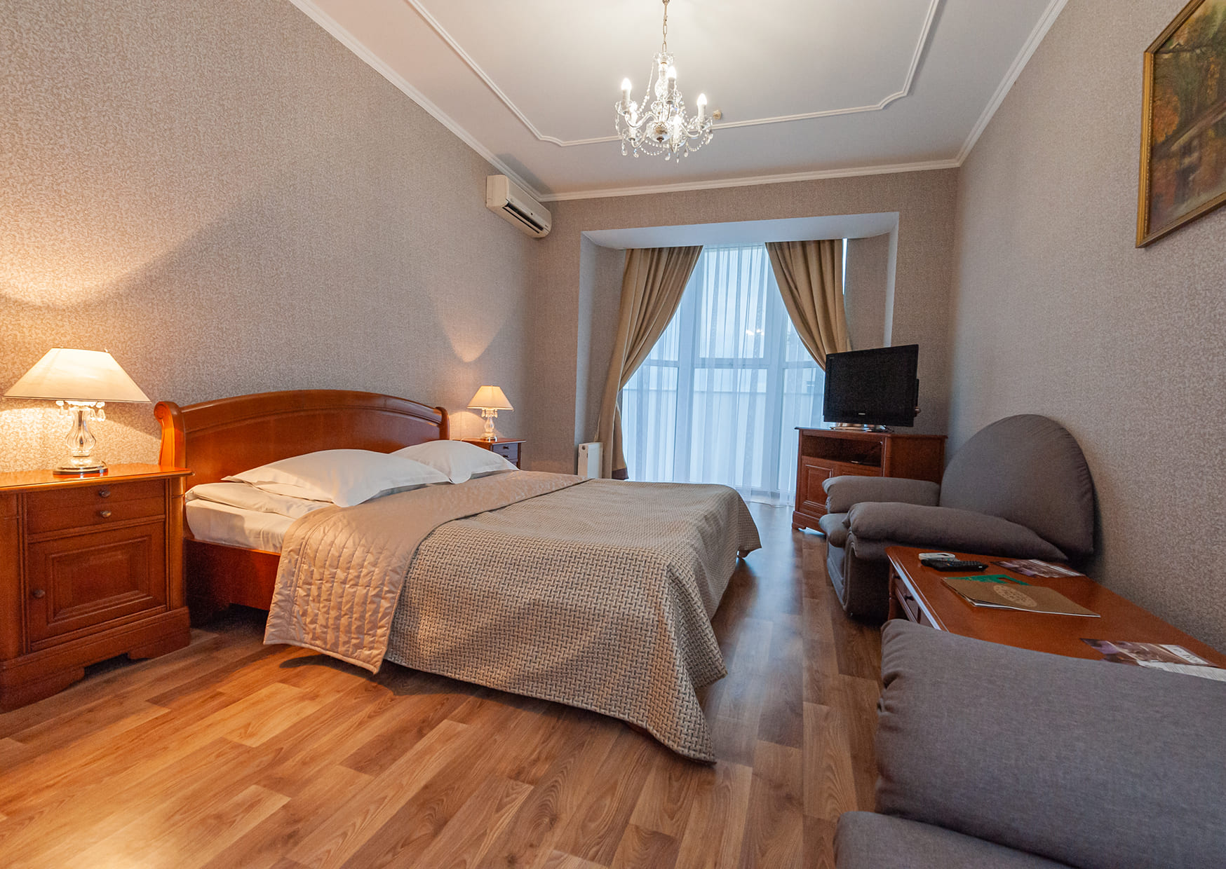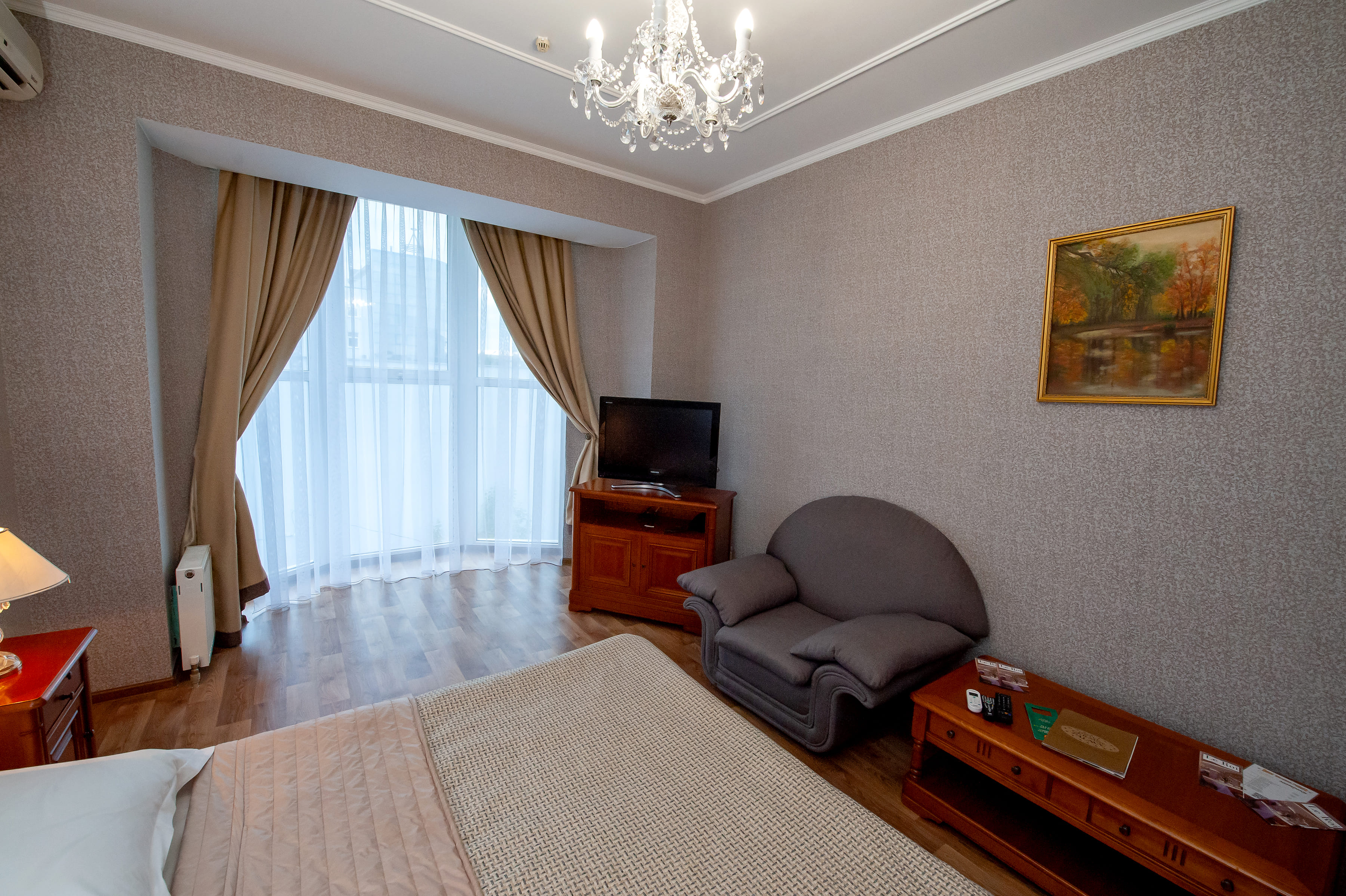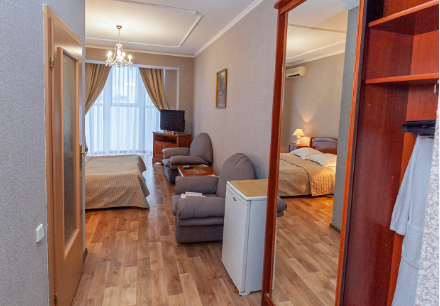Простора комфортабельна кімната. Свіжий дизайн, нові стильні меблі – у цьому номері вам буде приємно відпочити будь-якої пори року.